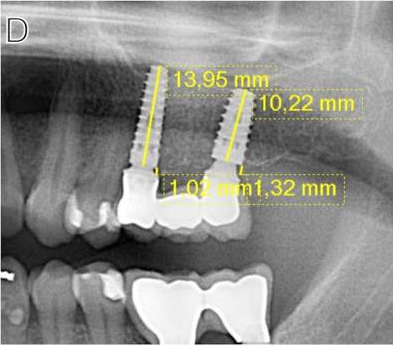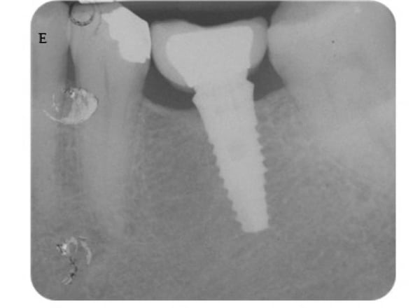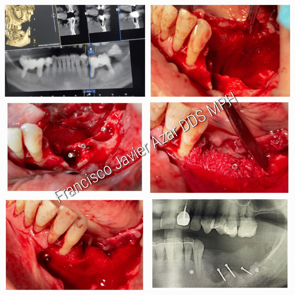 This patient presents with periimplantitis of the lower left quadrant. Removal of existing implants with Guided Bone Regeneration is required. The tent pole technique for GBR was used.