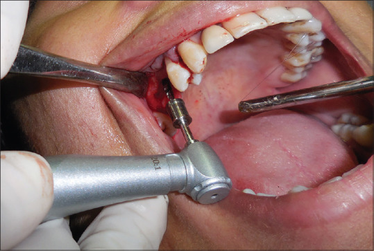 A palatal full thickness flap confirmed our suspicion. The root fragment was removed, the defect was degranulated, and the implant surface was decontaminated with a Nd:Yag laser.