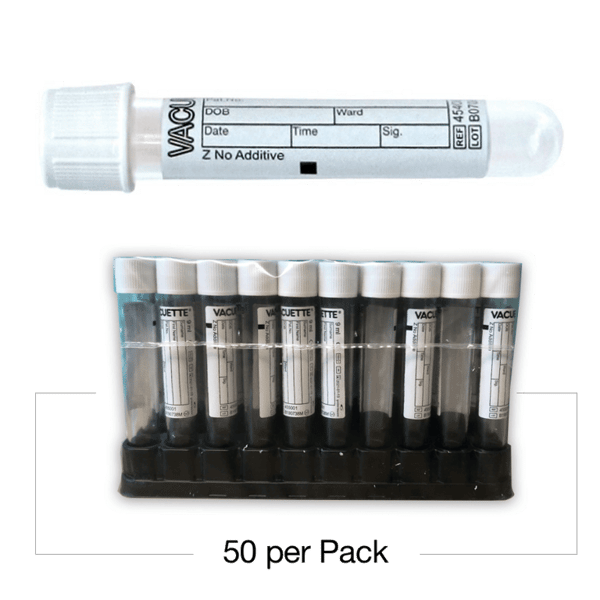 Greiner Vacuette pack of tubes. These tubes are 9 ml Z, plain plastic with No Additive! 16x100 white cap-black ring, non-ridged. 50 per box. Can be used to make iPRF or Liquid PRF, a liquid / injectable formulation of platelet rich fibrin (PRF).