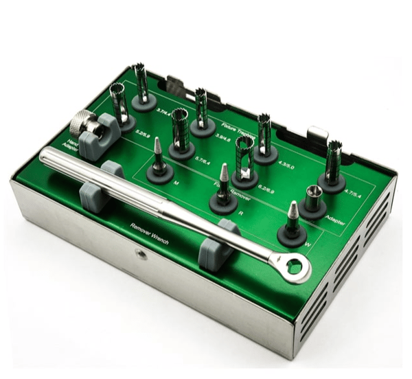 - 3 Specialized Implant Remover Screws for all popular implant systems.