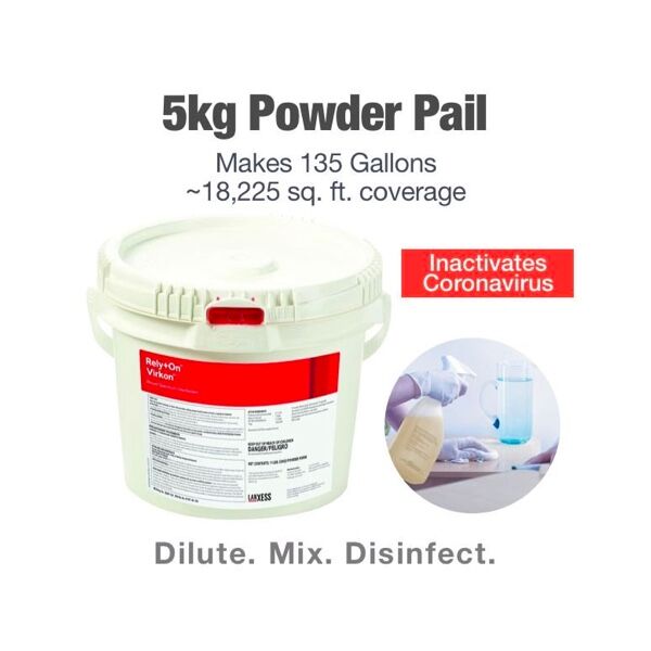 - Available in 5kg Powder in Pail. Makes 135 gallons (total sq. ft. disinfectant coverage = 18,225 sq. ft.)