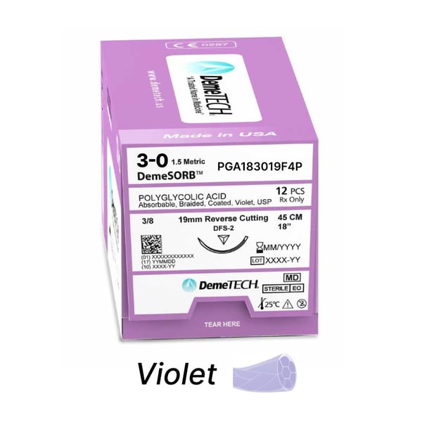 Polyglycolic Acid suture is a synthetic, absorbable, sterile, surgical suture composed of 100% glycolide. DemeTech’s Polyglycolic Acid Sutures are available in either violet or colorless.. Sutures by DemeTech - - Polyglycolic Acid, better known as PGA, is composed of polymers of glycolide acids. - DemeTech’s PGA is coated to allow for easier passage through tissues with only minimal drag. Coated PGA sutures facilitate: - Easy tissue passage - Precise knot placement - Smooth tie down - Greater tensile strength - A decreased tendency to irritate tissue