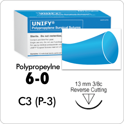 Polypropylene 6-0 Suture, from Unify, with P3 (C3) Reverse Cutting Needle (13mm, 3/8 Circle ). 18". Sold 12 per box.
